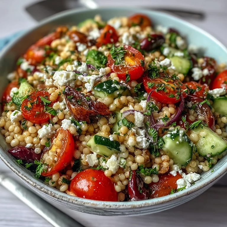 Bookmark A friend brought this to a picnic last summer, and I watched it disappear before the sandwiches even came out. The couscous had this satisfying chew, the vegetables were still crisp, and the feta added just enough salt to make you reach for another forkful. I asked for the recipe on the spot, scribbling notes on a napkin while she laughed at my urgency. That napkin is now taped inside my recipe binder, stained with olive oil and oregano.